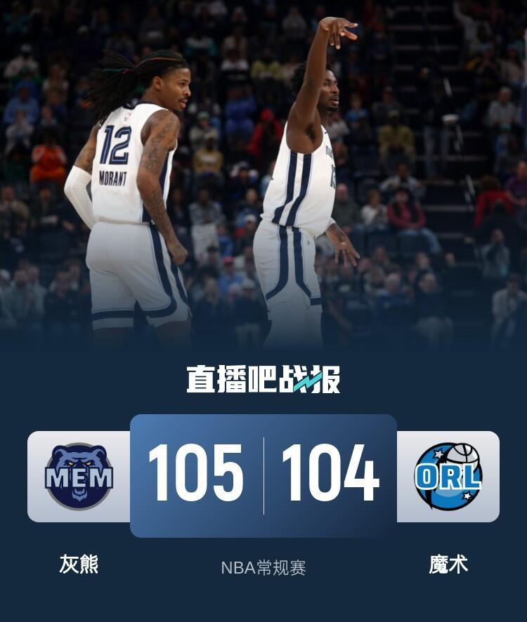 比赛开始,双方上来进攻端手感一般,多次走上罚球线,灰熊替补球员建功助队取得领先,班凯罗3犯陷入被动,首节灰熊领先7分,次节灰熊打了3分多钟仅得2分,小瓦格纳和科尔-安东尼轮番发力一度带队反超比分,半场双方打成53平。下半场,班凯罗接连杀伤砍下9分带队11-0建立主动权,灰熊半节多仅得4分,随后灰熊依靠替补止血,GG-杰克逊接连3记三分打出19-0超级攻击波一度反超比分,末节魔术接连三分命中重新掌握主动权,莫兰特三分终于开和继续带队追分,比分持续胶着,莫兰特上篮追平比分后贝恩两罚中一取得领先,阿尔达马关键两罚不中后班凯罗反击强打也不中,最终灰熊105-104险胜魔术。