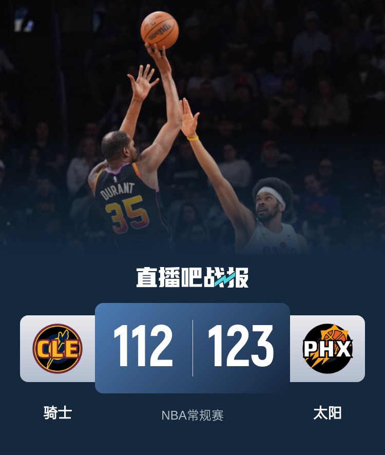 首节开局两队手感都非常火热, 开局不久双方曾有过合计13个回合打成12球的疯狂表现,两队首节均砍下至少34分势均力敌;次节骑士状态直线下滑,球队核心之一的米切尔半场8投1中状态全无;太阳这边替补端琼斯和奥尼尔成为奇兵半场合力砍下25分,太阳第二节净胜12分并带着11分优势进入下半场。休息归来骑士依旧无法阻止对手,杜兰特在第三节迎来爆发独得19分,太阳再第三节再胜8分的同时拉开19分的优势;末节太阳整体状态回落,但杜兰特个人发挥出色连续拿下关键分止住颓势,骑士追至个位数分差但时间所剩无几无力上演逆转。最终,太阳主场击败骑士,并送骑士4连败。