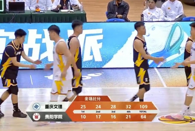 最后一节,王怡钧上来连续拿分带领贵阳学院一度打出10-2略微缩小分差,但随后他们进攻断电,重庆文理重新找回节奏又是攻势连连,场上分差不断被拉大。全场比赛结束,重庆文理学院109-64大胜贵阳学院。