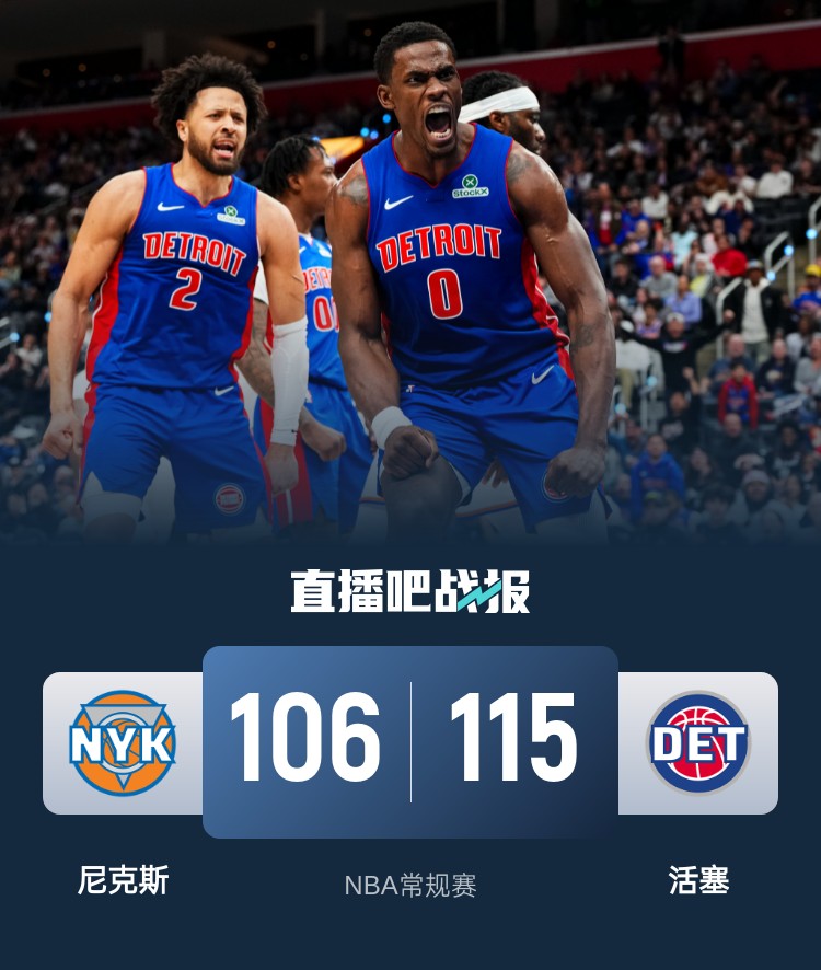 4月11日讯 NBA常规赛,活塞主场迎战尼克斯。尼克斯50胜29负东部第3,活塞43胜36负东部第6。
