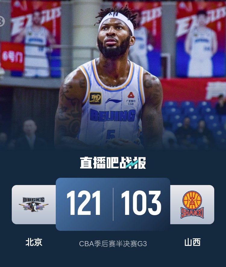比赛开始,双方开场势均力敌,比分交替领先,张宁火力全开,杰曼高效输出强势回应,两队大打对攻,次节依旧打得难解难分,山西冲击内线连投带罚拿分,北京多点开花完成反超,奥莫特飙中压哨三分,半场战罢北京61-60领先山西1分。易边再战,杰曼延续火力,内外开花单节砍下15分,北京攻防两端取得压倒性优势,单节净胜22分,末节北京命中率下降,山西内外开花迫近比分,翟晓川三分稳住局势,山西苦苦追赶,无奈此前挖坑太大。最终,北京121-103击败山西,总比分3-0横扫对手,挺进总决赛。