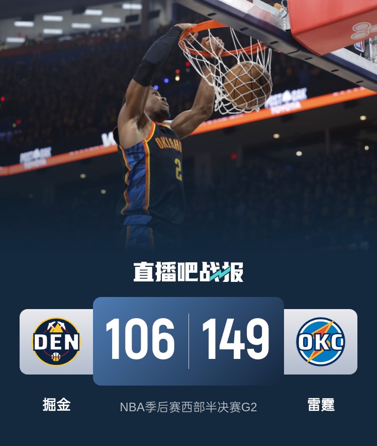 雷霆(1-1):亚历山大34分4板8助、杰伦威17分4板7助2帽、霍姆格伦15分11板2助2断2帽、哈尔滕施泰因14分8板5助、乔14分1板2助、多特12分1板、维金斯10分5板、米切尔10分、华莱士8分2板2助2断、肯威4分3板1助2断、狄龙-琼斯4分1板1助、杰林威3分2板2助、吉昂2分2板1助、卡鲁索2分