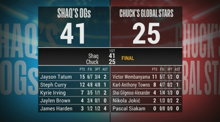 比赛开始,库里骑马射箭抛进三分为奥尼尔队开局,而巴克利队连续6次出手三分都不中,反观塔图姆连续三分连砍8分打出11-0开局,亚历山大罚球为巴克利队拿到首分。暂停期间进行全明星交接仪式和致敬TNT解说天团,文班亚马命中首记三分,但欧文联手杰伦-布朗能帮助球队守住10分左右领先,随后库里连续三分拿到赛点,塔图姆空切扣空篮杀死比赛,最终奥尼尔队41-25战胜巴克利队,拿到冠军!
