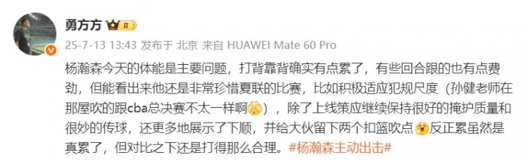 @勇方方 在个人微博上写道:“杨瀚森今天的体能是主要问题,打背靠背确实有点累了,有些回合跟的也有点费劲,但能看出来他还是非常珍惜夏联的比赛,比如积极适应犯规尺度(孙健老师在那屋吹的跟cba总决赛不太一样啊),除了上线策应继续保持很好的掩护质量和很妙的传球,还更多地展示了下顺,并给大伙留下两个扣篮吹点。反正累虽然是真累了,但对比之下还是打得那么合理。”