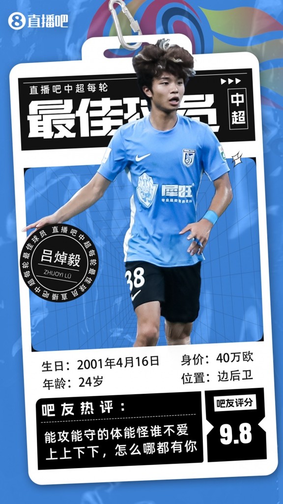 在【第19轮中超最佳】评选中,吕焯毅获得了吧友以及编辑的双双认可,首次当选每轮最佳球员。