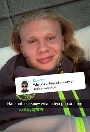 在曼城大胜狼队的赛前,哈兰德在社交媒体发布自拍并定位伍尔弗汉普顿,有球迷留言询问他对这座城市的看法。挪威国脚回复道:“哈哈哈,我知道你想干嘛。”