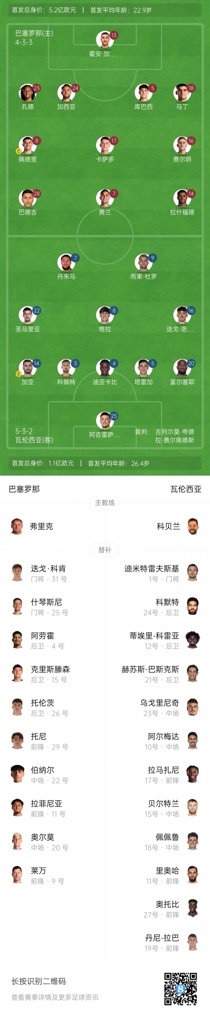 瓦伦西亚首发:25-阿吉雷萨巴拉、20-富尔基耶、5-塔雷加、4-迪亚卡比、3-科佩特、14-加亚、22-圣马里亚、8-格拉、16-迭戈·洛佩斯、7-丹朱马、9-雨果·杜罗