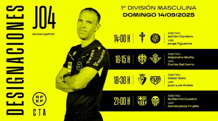 9月13日讯 当地时间周日(9月14日)进行的西甲第4轮四场比赛裁判已经确定,具体任命如下: