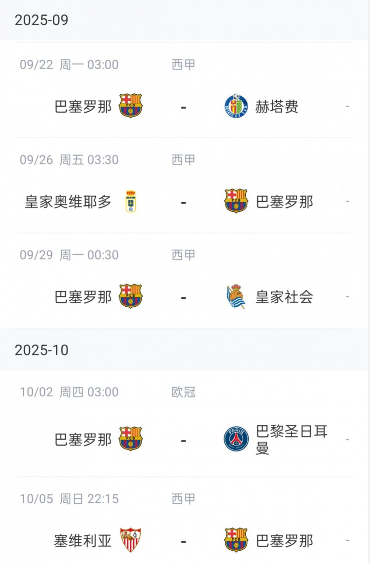在接下去两周左右的时间里,巴萨将有5场比赛要踢,他们具体的赛程如下图: