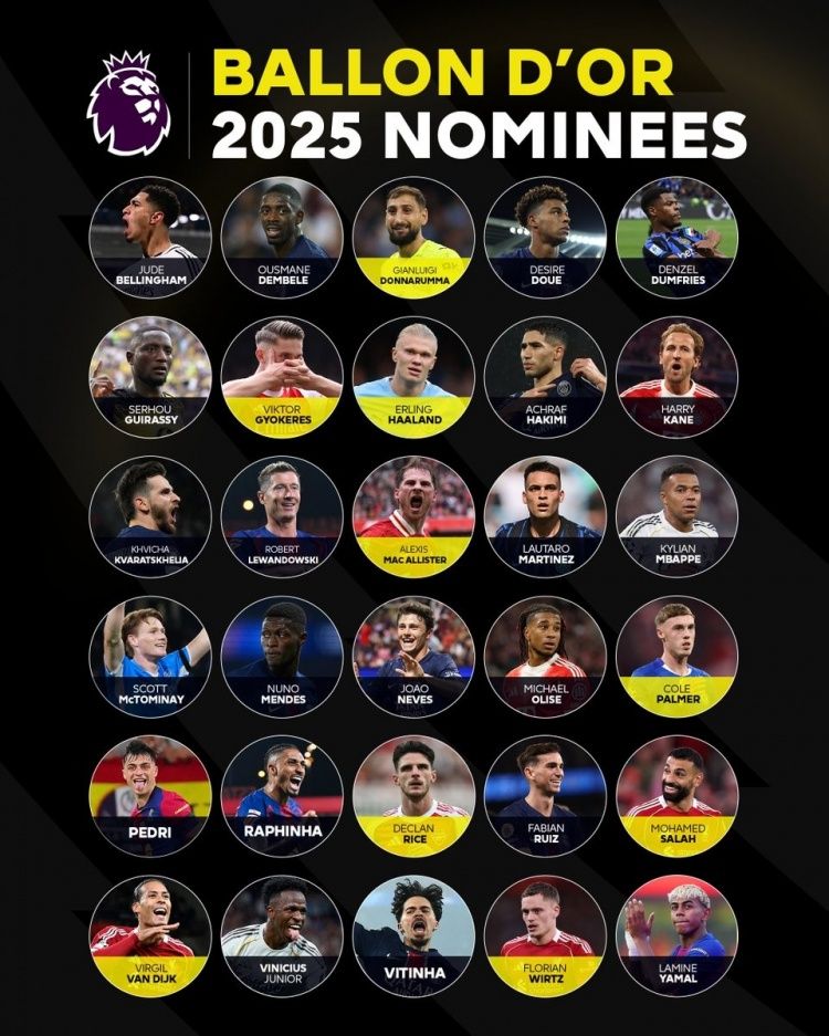 拉菲尼亚(巴萨)、约克雷斯(阿森纳/葡萄牙体育)、杜埃(巴黎)、邓弗里斯(国米)、麦克托米奈(那不勒斯)