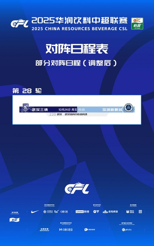 根据2025华润饮料中超联赛赛程,武汉三镇对阵深圳新鹏城比赛将于10月25日19:35在武汉体育中心体育场进行,因武汉体育中心大型活动,为保证本场比赛安全有序进行。经武汉赛区申请,协商武汉三镇足球俱乐部、深圳新鹏城足球俱乐部以及有关方面同意,现决定将武汉三镇对阵深圳新鹏城比赛进行调整,具体调整如图。