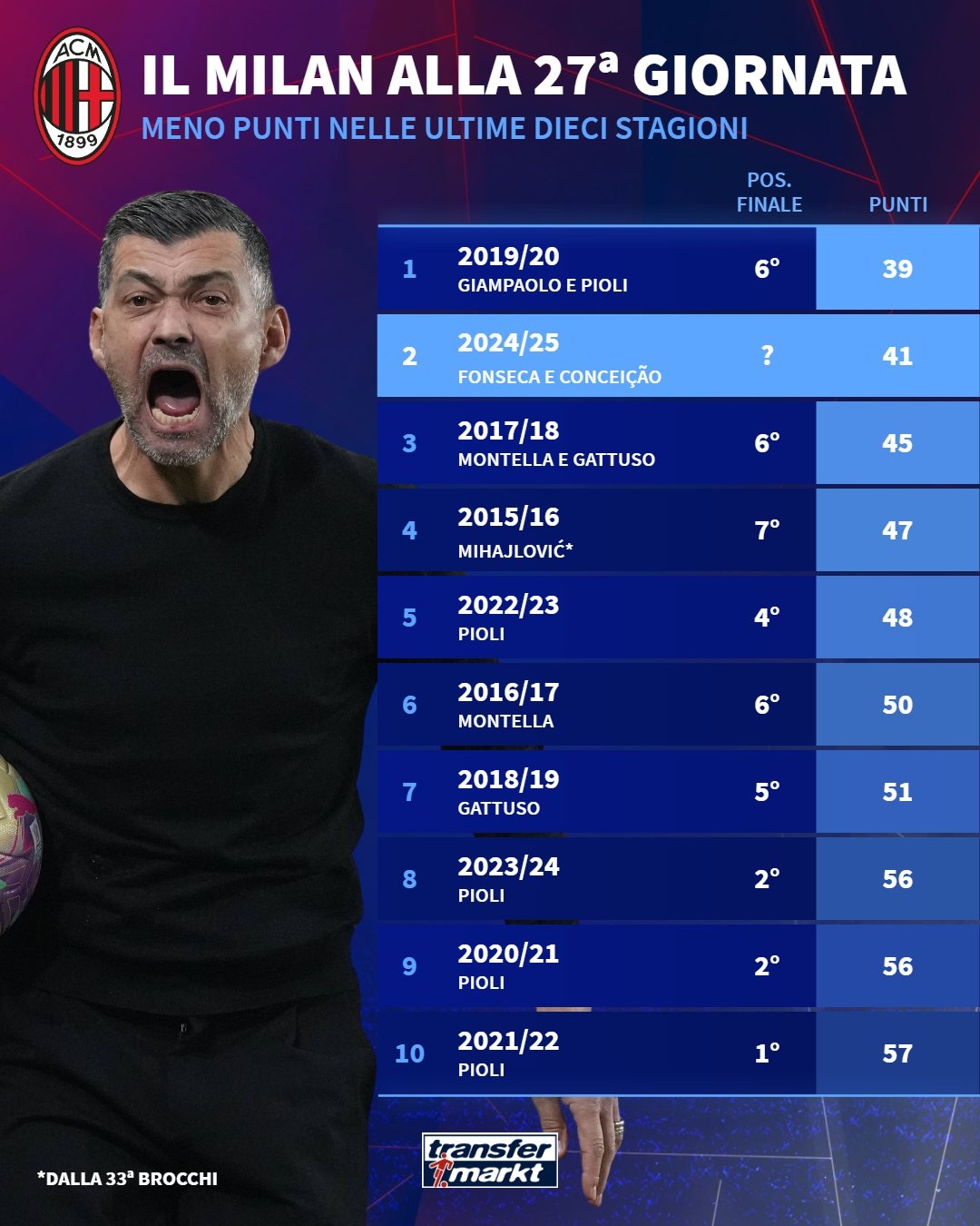 27轮41分是米兰过去10年意甲同期的第二低分,仅高于2019/20赛季的39分,那个赛季球队最终排名意甲第六位。