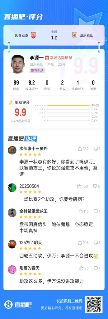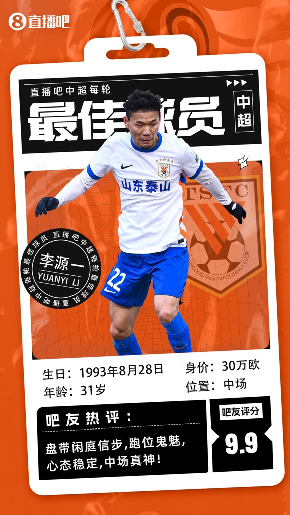 【】中超第5轮最佳球员评选出炉,本轮贡献2次助攻的“国产助攻王”李源一当选,吧友评分9.9分。