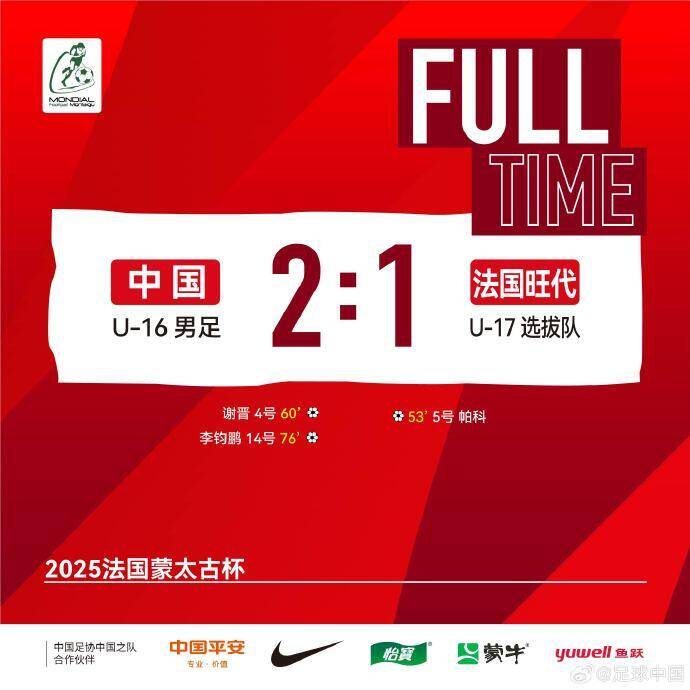 全场比赛结束,U16国足2-1逆转旺代省U17。