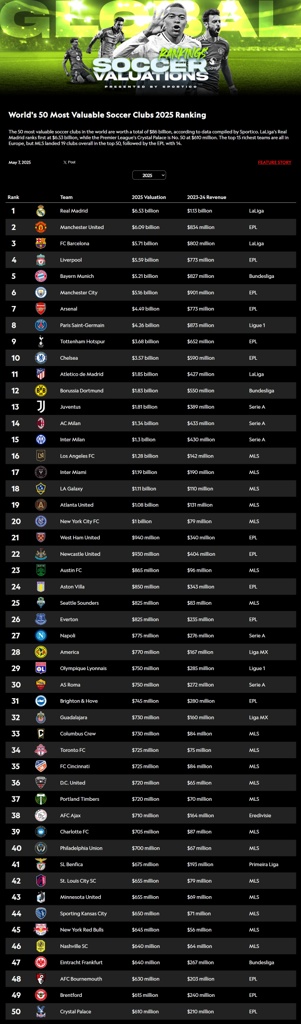 05月09日讯 美国媒体Sportico的数据统计显示,全球足坛50支最有价值俱乐部总价值为860亿美元。皇马和曼联均以超过60亿美元的价格,位居榜单前二。