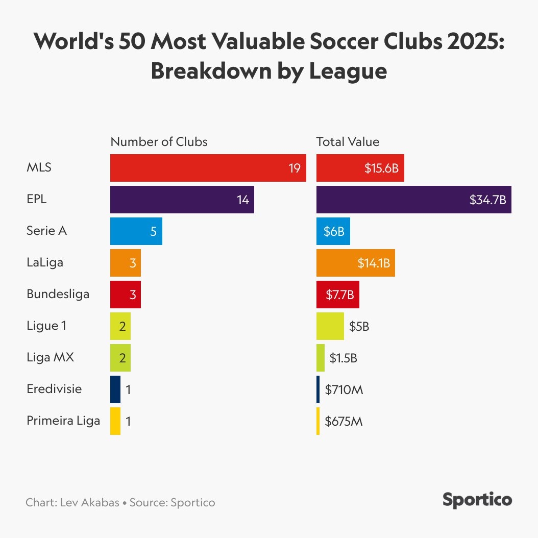 前15名均为欧洲球队,而美职联则在50支球队的榜单中占了19队,多于14队的英超。意甲五队入选,西甲只有皇萨竞三队进入榜单,德甲同样只有三队,法甲则只有两队。