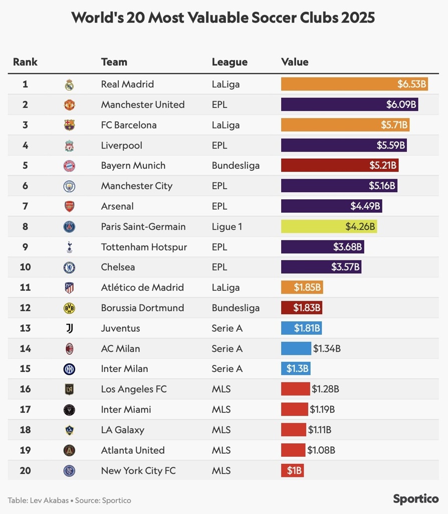 美媒盘点足坛俱乐部估值TOP20(单位:美元):