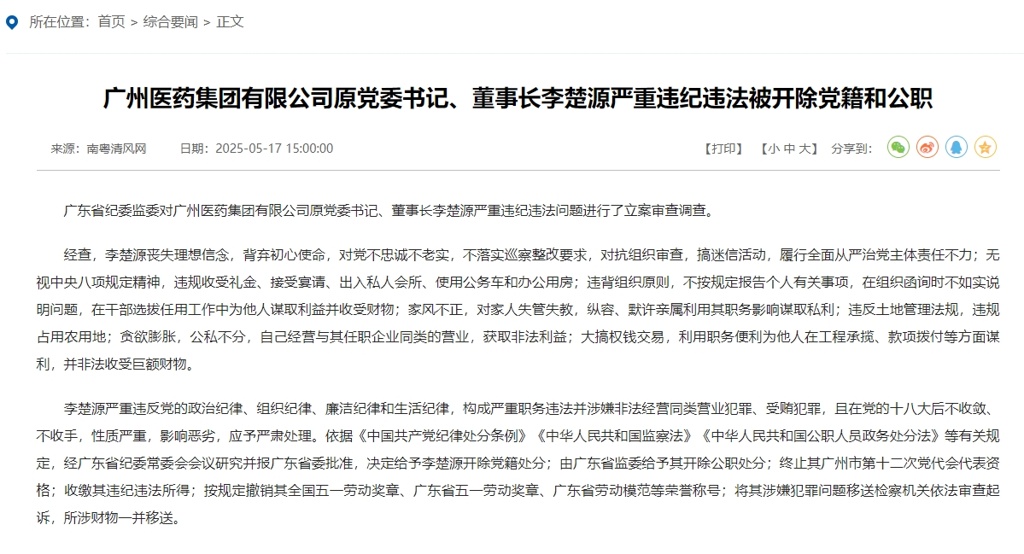 广药原董事长李楚源严重违纪违法被开除党籍和公职
