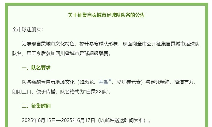 6月16日讯 据澎湃新闻报道,四川自贡市教育和体育局自6月15日起向全市公开征集自贡城市足球队队名,用于今后参加四川省城市足球超级联赛。