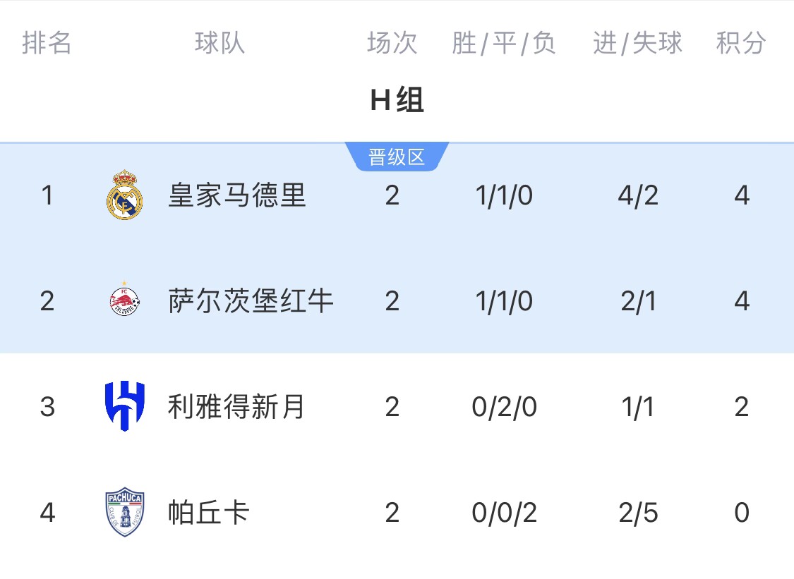 1、皇马胜:皇马小组第1晋级,新月小组第2晋级,萨尔茨堡红牛出局