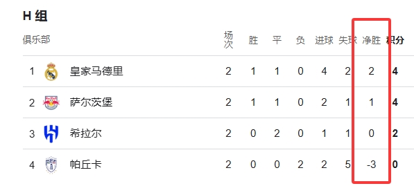 3、皇马平萨尔茨堡红牛,三队同积5分,因三队相互均为平局,因此直接比较“三队小循环”相关球队的总进球数。