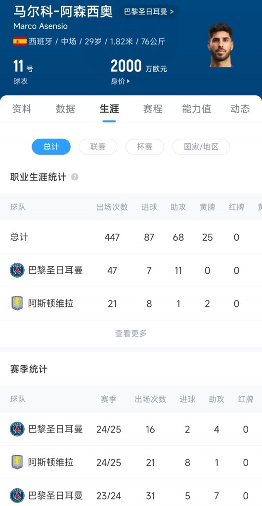 29岁的西班牙前锋马尔科-阿森西奥,上赛季后半段被巴黎租借至阿斯顿维拉,代表维拉出战21场比赛,贡献8粒进球和1次助攻。目前阿森西奥的德转身价为2000万欧元,而在2018年效力皇马时期,阿森西奥身价最高曾达到9000万欧元。